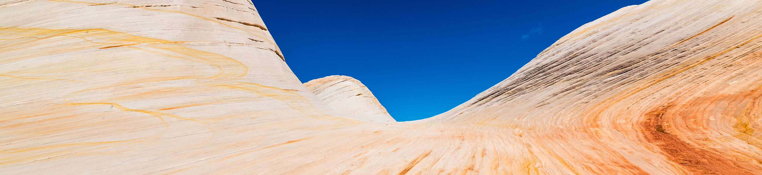 Réveil plus tard que prévu. Encore un peu fatigué de mon problème de la veille mais ça va tout de même bien mieux. Je vais néanmoins faire une journée calme afin de ré-attaquer une session de randos dont Salt Trail Canyon dans les jours à venir. Avant de partir (tard) du motel, je prends quelques minutes pour décider de ce que je vais faire aujourd’hui, sachant que je dois me diriger vers Lee’s Ferry où je ferai demain le Spencer Trail. Ce sera donc Johnson Canyon et son petit slickrock facile à atteindre pour commencer. Le temps de faire un réapprovisionnement au Walmart du coin, de faire la route (près de 2h) et de manger, je commence la balade en début d’après-midi. Je descends dans le grand wash et remonte de l’autre côté où les fils barbelés sont affaissés. Ensuite, c’est une dizaine de minutes de marche seulement pour arriver à l’objectif. La zone de slickrock, de petite taille, est parcourue au sol de jolies stries jaunes et blanches. Deux formations rocheuses coniques étonnantes, visibles dès le début de la marche, semblent garder les lieux au pied de la falaise.