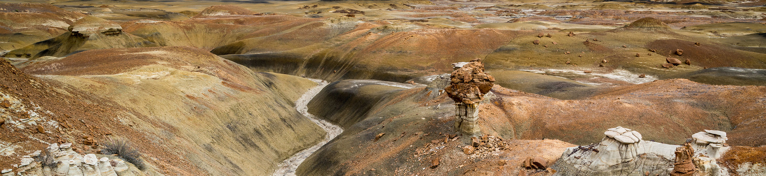 Au loin, j’aperçois des zones de hoodoos qui me semblent intéressants. Pour y parvenir, il faut descendre avec prudence les collines colorées en trouvant son propre chemin. C’est assez glissant et il y a surtout des mini-canyons flanqués au sol de trous dont il faut se méfier. Il ne sont pas forcément très grands en apparence mais l’espace en-dessous l’est beaucoup plus. Un peu plus loin, les couleurs changent. Du jaune au rouille puis du rouille au blanc. Avec quelques formations rocheuses photogéniques en cours de route.