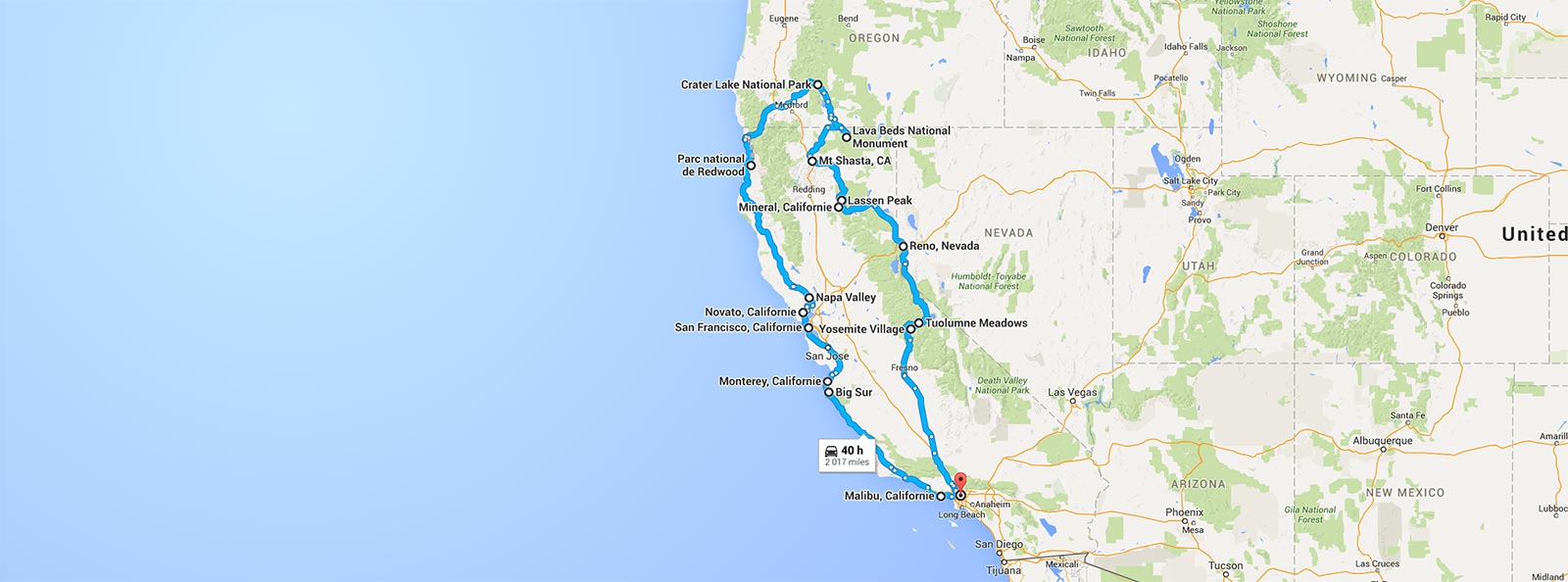 Après être parti seul dans le sud-ouest américain au printemps 2015, j’ai eu la chance de retourner aux Etats-Unis environ deux mois plus tard, fin juin et début juillet. Mais cette fois, nous étions bien deux. Ce voyage était prévu depuis plusieurs mois et m’a demandé pas mal de préparation. En effet, au départ, il était question de partir trois semaines, plutôt du côté de l’Utah. Mais pour diverses raisons, notre durée de séjour a dû être raccourcie à deux grosses semaines. Après réflexion, notre choix s’est porté sur le nord de la Californie que je ne connaissais pas encore (et qui est largement délaissé par les touristes étrangers), avec une petite incursion dans le sud de l’Oregon. La préparation du voyage a donc nécessité plus de recherches que d’habitude, notamment au niveau des hébergements. Nous ne savions pas si la région serait très fréquentée à cette période de l’année et quel serait donc le taux de remplissage des motels. Nous aurions pu faire un peu de camping, mais cela demandait du matériel supplémentaire à emporter et, à vrai dire, nous voulions un peu plus de confort…